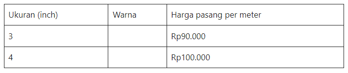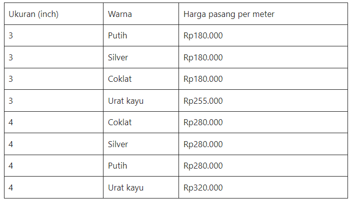 Ketika mempertimbangkan untuk menggunakan kusen aluminium dalam proyek Anda, salah satu pertanyaan penting yang muncul adalah berapa biaya pemasangan yang perlu disiapkan. Oleh karena itu, dalam tabel berikut, kami akan menyajikan estimasihargajasapasang kusen alumuniumper meter untuk tahun 2023. Namun, perlu diingat bahwa harga ini dapat bervariasi tergantung pada sejumlah faktor, seperti ukuran, jenis kusen aluminium yang digunakan, dan juga lokasi pemasangan. Dengan informasi ini, Anda akan lebih siap dalam merencanakan anggaran dan memilih penyedia jasa yang sesuai dengan kebutuhan.