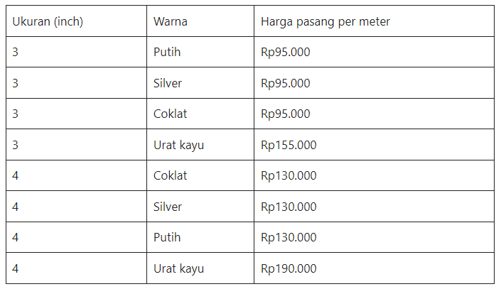 Salah satu merk kusen aluminium yang sering menjadi pilihan di kalangan masyarakat adalah Alexindo . Merk lokal ini dikenal memiliki kualitas yang cukup unggul dan memiliki aplikasi yang luas, baik untuk bangunan rumah maupun perkantoran. Merk Alexindo menawarkan banyak pilihan warna dan proses finishing yang beragam. Ini memungkinkan mengkustomisasi tampilan kusen aluminium sesuai dengan preferensi desain. Jika ingin mengetahui lebih lanjut tentanghargajasapasang kusen alumuniumper meter dengan merk Alexindo, berikut adalah daftarhargayang telah kami sediakan :